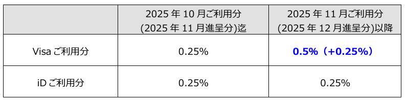 2025年11月以降ご利用分より、「VポイントPay」のVisaご利用特典を0.5%に引き上げいたしました。また、本引き上げに伴い、クレジットカードでのチャージ特典※は2025年11月以降チャージ分より廃止いたしました。