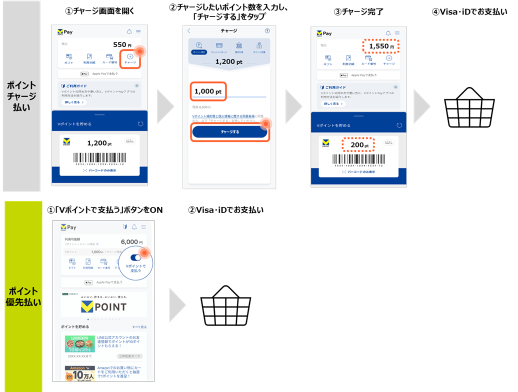 「VポイントPayアプリ」にて「Vポイントで支払う」のボタンをONにすることで、Visa・iDのお支払い時に優先的にVポイントを使用します。自動でVポイントを「VポイントPay」にチャージのうえお支払いに使用するため、お支払い前の事前チャージが不要となります。