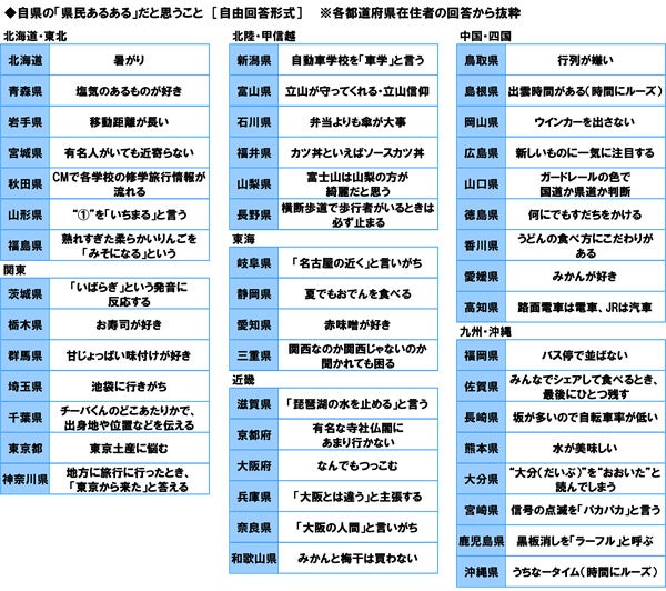 ◆自県の“県民の特徴”を表す一言 秋田県「ええふりこき」、群馬県「かかあ天下」、山梨県「地元愛」、愛知県「派手好き」、大阪府「いらち」、岡山県「我が道を行く」、広島県「熱しやすく冷めやすい」、香川県「へらこい」、高知県「酒飲み」、福岡県「熱い」、熊本県「わさもん」、沖縄県「よんなーよんなー」