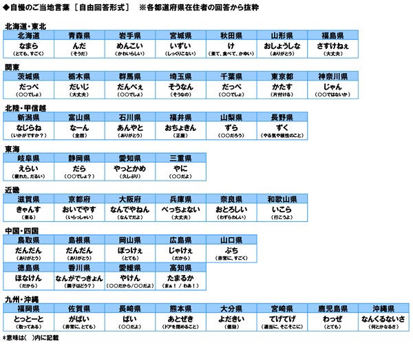 ◆自県の好きなご当地言葉 宮城県「いずい」、福島県「さすけねぇ」、埼玉県「そうなん」、東京都「かたす」、富山県「なーん」、静岡県「だら」、三重県「やに」、滋賀県「きゃんす」、奈良県「おとろしい」、和歌山県「いこら」、広島県「じゃけぇ」、愛媛県「やけん」、高知県「たまるか」、佐賀県「がばい」、熊本県「あとぜき」、宮崎県「てげてげ」、沖縄県「なんくるないさ」