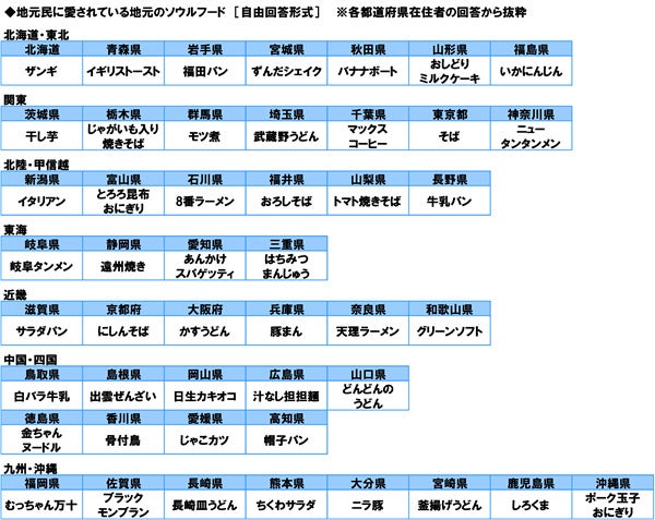◆地元民に愛されている地元のソウルフード 北海道「ザンギ」、青森県「イギリストースト」、山形県「おしどりミルクケーキ」、栃木県「じゃがいも入り焼きそば」、群馬県「モツ煮」、新潟県「イタリアン」、山梨県「トマト焼きそば」、三重県「はちみつまんじゅう」、滋賀県「サラダパン」、広島県「汁なし担担麺」、愛媛県「じゃこカツ」、鹿児島県「しろくま」、沖縄県「ポーク玉子おにぎり」