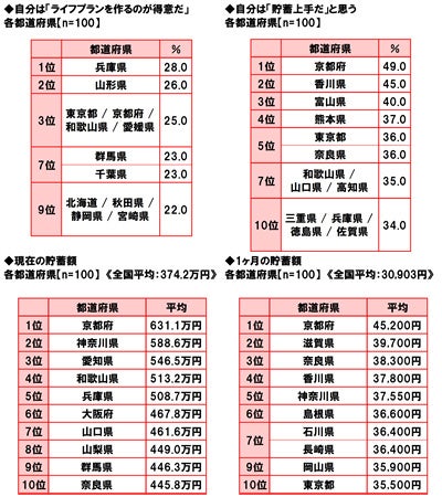 ◆“ライフプラン作りが得意”1位は「兵庫県」、“貯蓄上手”1位は「京都府」