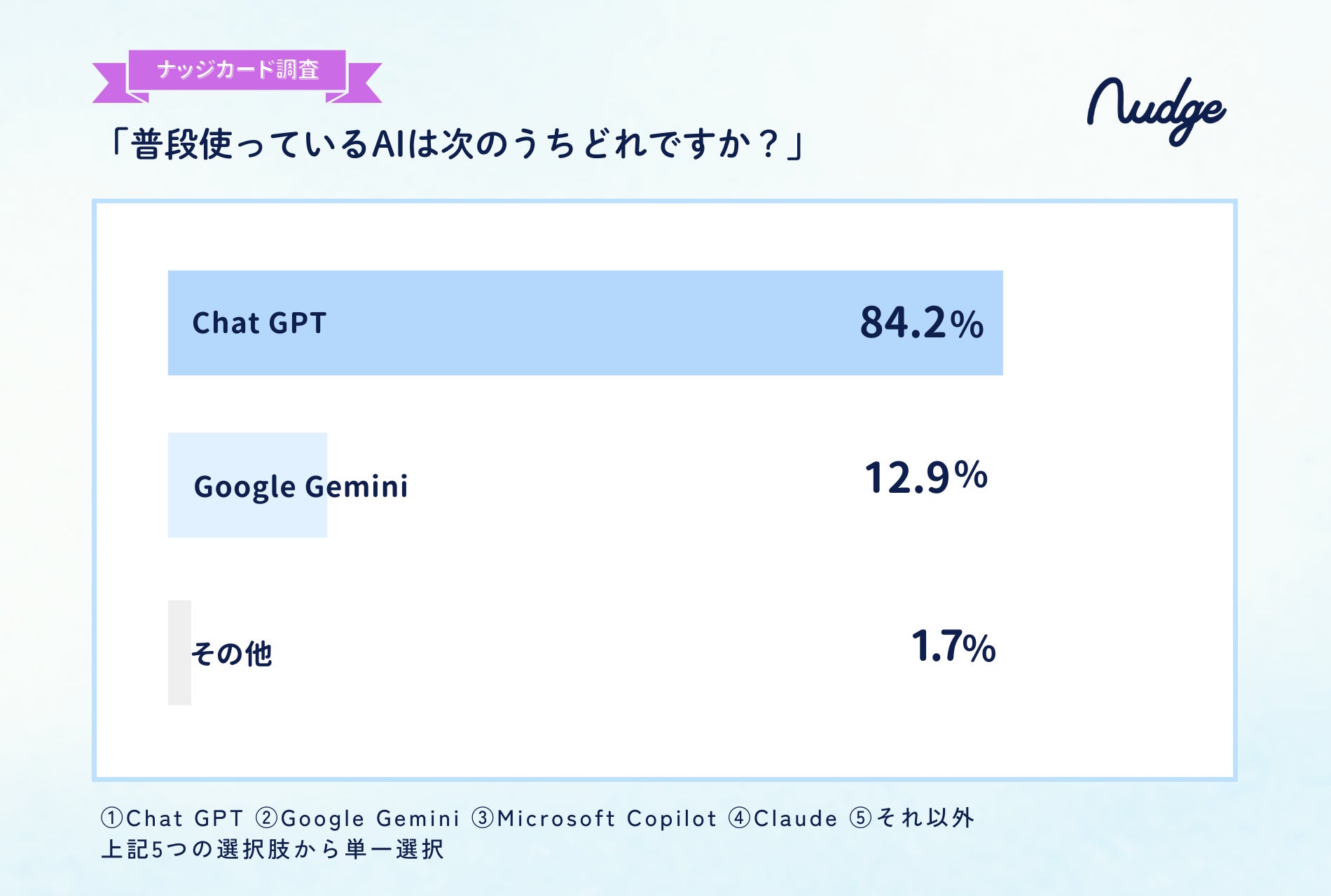 「普段使っているAIは次のうちどれですか?」という質問に対しては、「ChatGPT」が84.2%と圧倒的多数を占め、他のAIサービスとの差が大きい結果となりました。