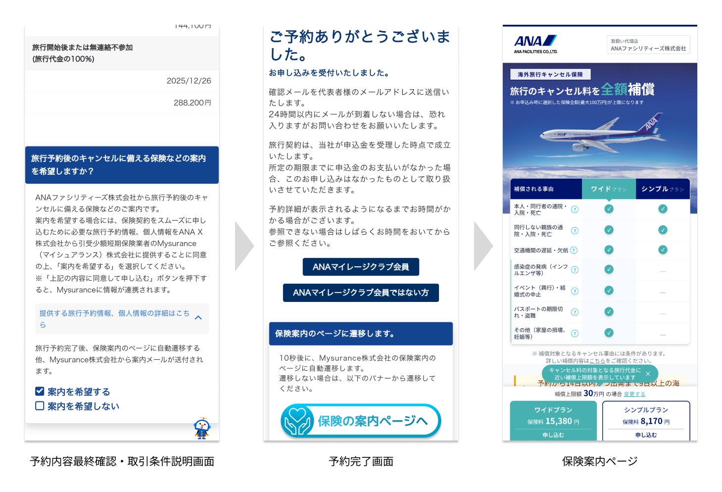 ANA X株式会社(本社:東京都中央区、代表取締役社長:神田 真也、以下「ANA X」)、ANAファシリティーズ株式会社(本社:東京都中央区、代表取締役社長:近藤 博之、以下「ANAファシリティーズ」)、損害保険ジャパン株式会社の子会社で少額短期保険業を営むMysurance(マイシュアランス)株式会社(本社:東京都新宿区、代表取締役社長:清水 廣臣、以下「Mysurance」)は、ANAトラベラーズ 海外ダイナミックパッケージ(航空券+宿泊)および海外パッケージツアー(現地日本語ガイド同行/添乗員同行ツアー)の予約と同時に、簡単かつシームレスに手続きが可能な「海外旅行キャンセル保険」のご案内を2025年12月17日より開始します。