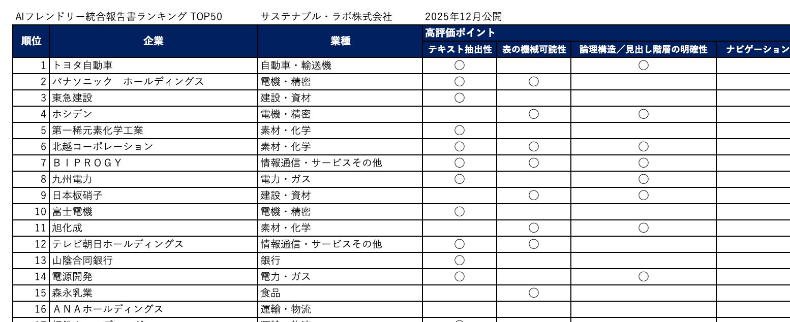 サステナブル・ラボ、『AIフレンドリー統合報告書ランキング TOP50(2025年版)』を公開