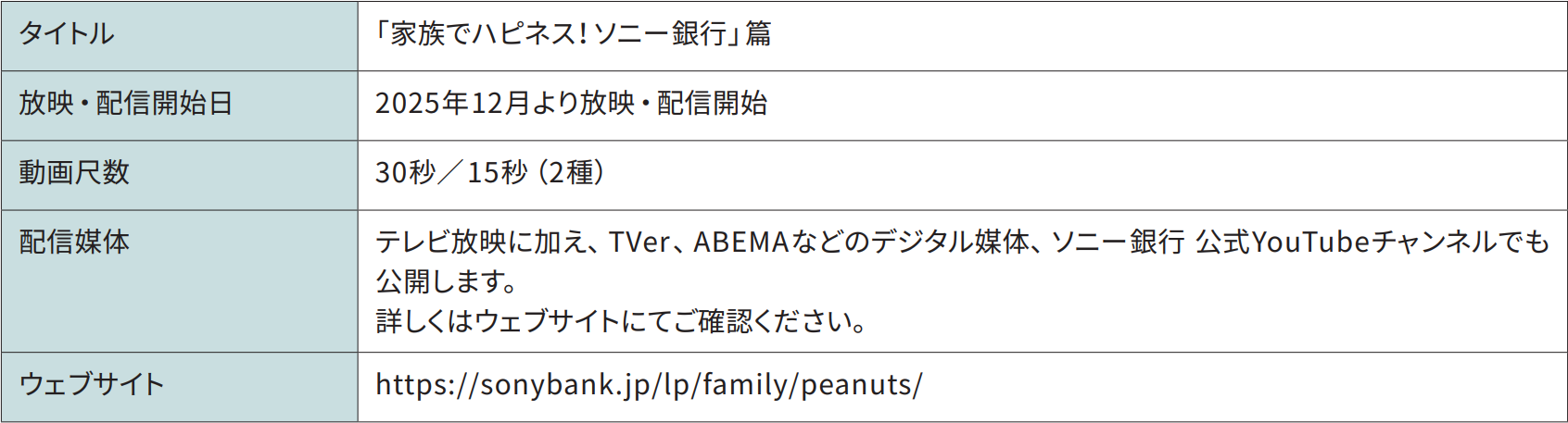 本CMでは、ソニー銀行のファミリーサービスを軸に、「家族の笑顔を増やす」「家族の負担を減らす」というふたつのテーマのもと、家族想いのさまざまなサービスをご紹介します。シネマスコープの外にはスヌーピーとウッドストックが登場し、「PEANUTS」のユーモアと温かさを活かしながら、何気ない日常にあふれる家族のハピネスと、「自分らしく生きる」人生に寄り添う姿勢を表現しています。