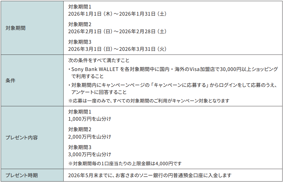 みなさまのご愛顧に感謝して、2026年1月5日(月)より「Sony Bank WALLET 10周年記念キャンペーン」を実施しますので、お知らせします。