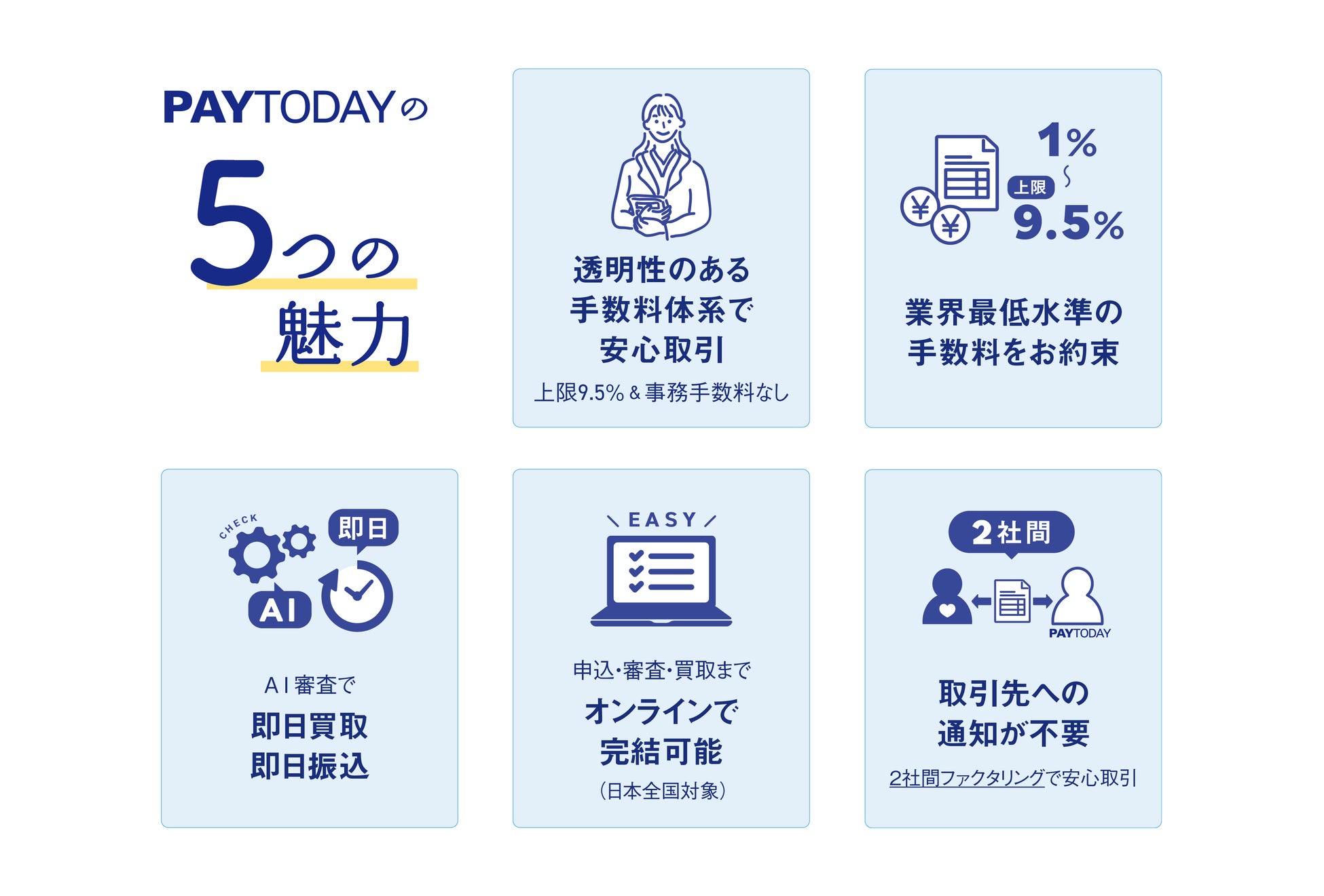 AI ファクタリングPAYTODAYでは、(1) フリーランス/個人事業主の素早い資金調達、(2) ベンチャー/スタートアップ企業の増加運転資金への対応、(3)地方企業のオンラインでの資金調達支援の3つを主軸として打ち出しており、女性でも安心して利用できるサービスを提供している中、リピーター/口コミを中心にお客様の支持を頂いています。