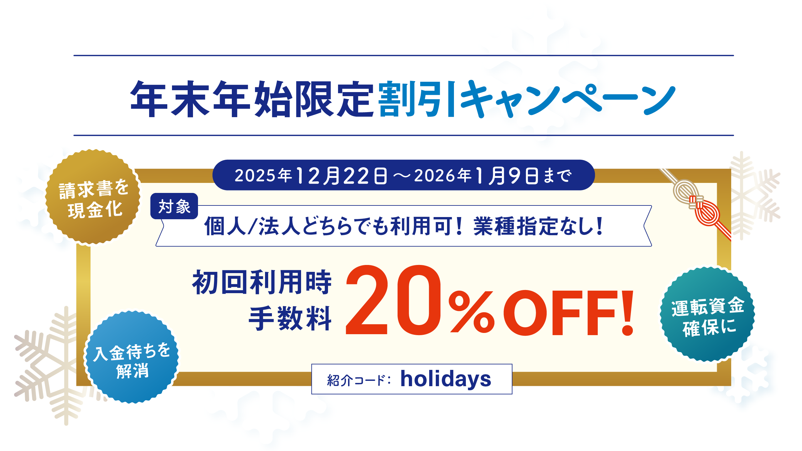 Dual Life Partners 株式会社(本社:東京都港区南青山2丁目)が提供する”即日振込のAIファクタリングサ ービス(請求書買取)のPAYTODAY”(URL: https://paytoday.jp )は、年末年始割引キャンペーンを2025年12月22日(月)から2026年1月9日(金)までの期間限定で実施します。