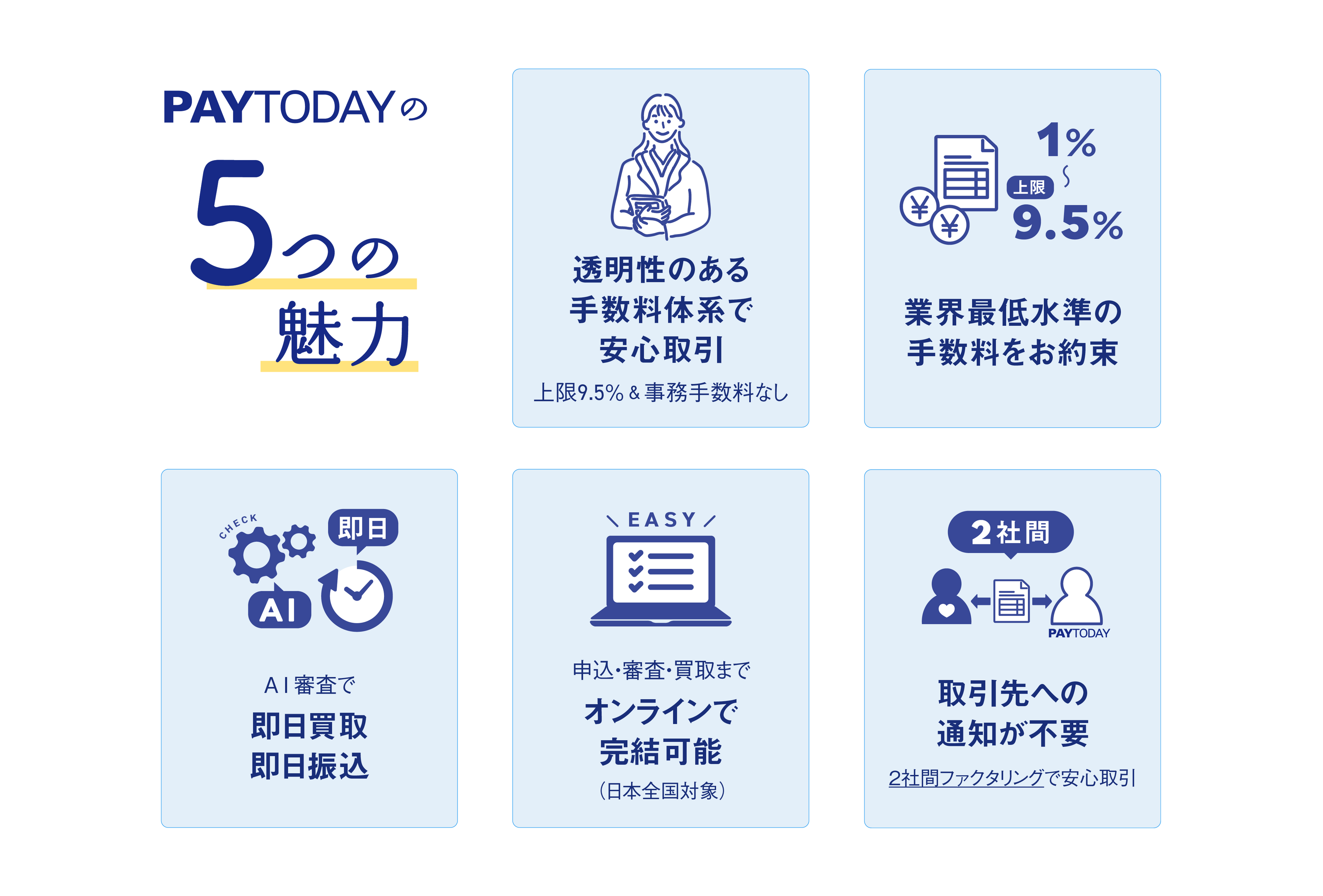 AI ファクタリングPAYTODAYでは、(1) フリーランス/個人事業主の素早い資金調達、(2) ベンチャー/スタートアップ企業の増加運転資金への対応、(3)地方企業のオンラインでの資金調達支援の3つを主軸として打ち出しており、女性でも安心して利用できるサービスを提供している中、リピーター/口コミを中心にお客様の支持を頂いています。