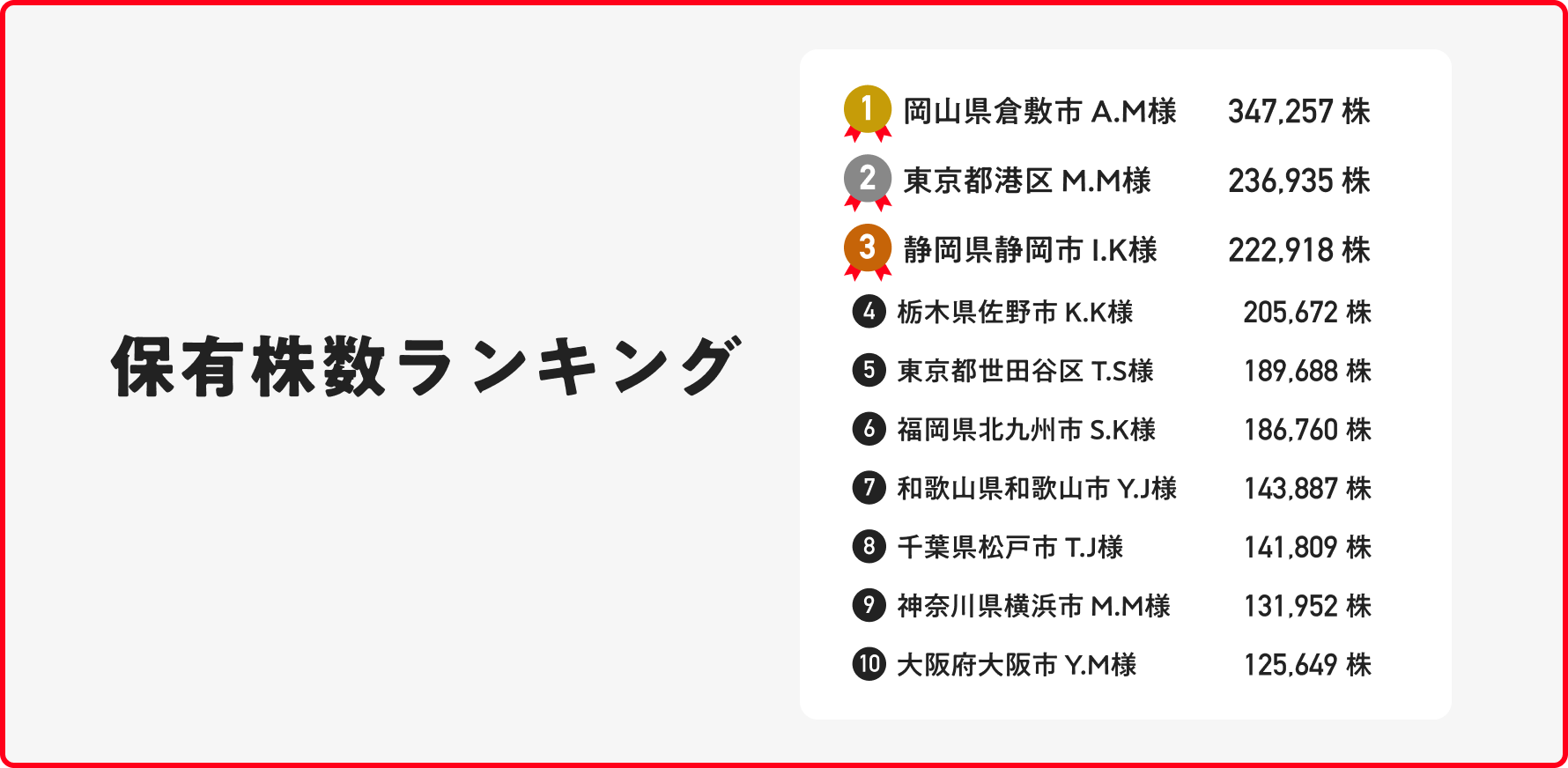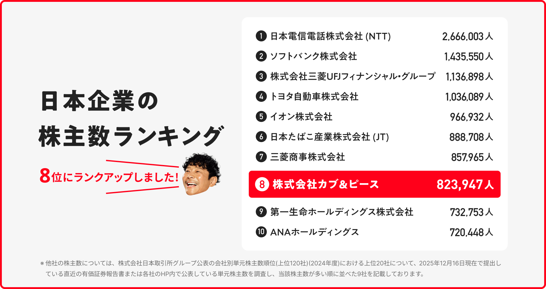 第2期株式の割当てにより、当社の株主数は823,947人となり、日本企業の中で第8位にランクインしました。株主数上位にランクインする各社の株主数が増加する中において、当社は第1期株主誕生時から株主数を着実に伸ばし、株主数ランキングで1ランクアップとなりました。
