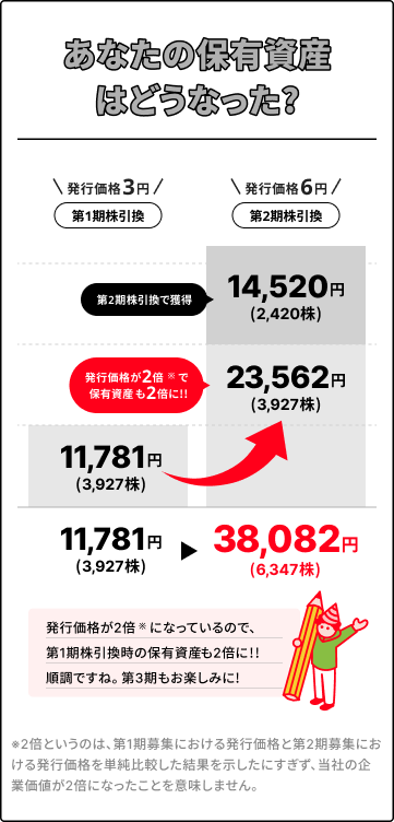 *2 評価額とは、「現在お持ちの株数」に、第1期募集の発行価格(1株3円)、第2期募集の発行価格(1株6円)、それぞれを乗じて算出した参考数値であり、実際の保有資産とは異なります。