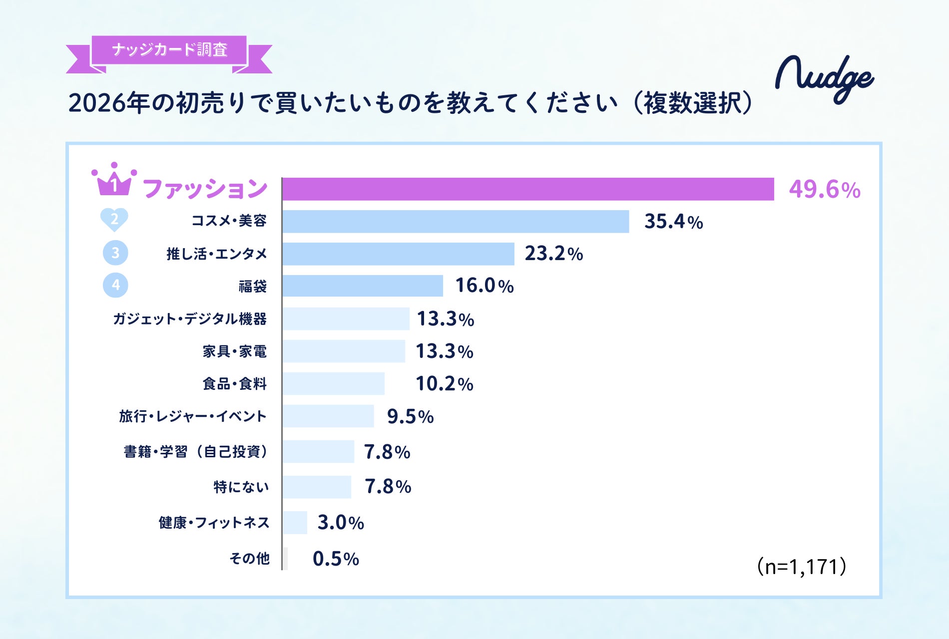 ナッジ株式会社(本社:東京都千代田区、代表取締役:沖田 貴史)は、次世代クレジットカード「Nudge(ナッジ、以下「ナッジカード」)の「学生部」カードユーザー1,171名を対象に、「2025年の買い物実態および2026年初売りに関するアンケート調査」を実施しました。