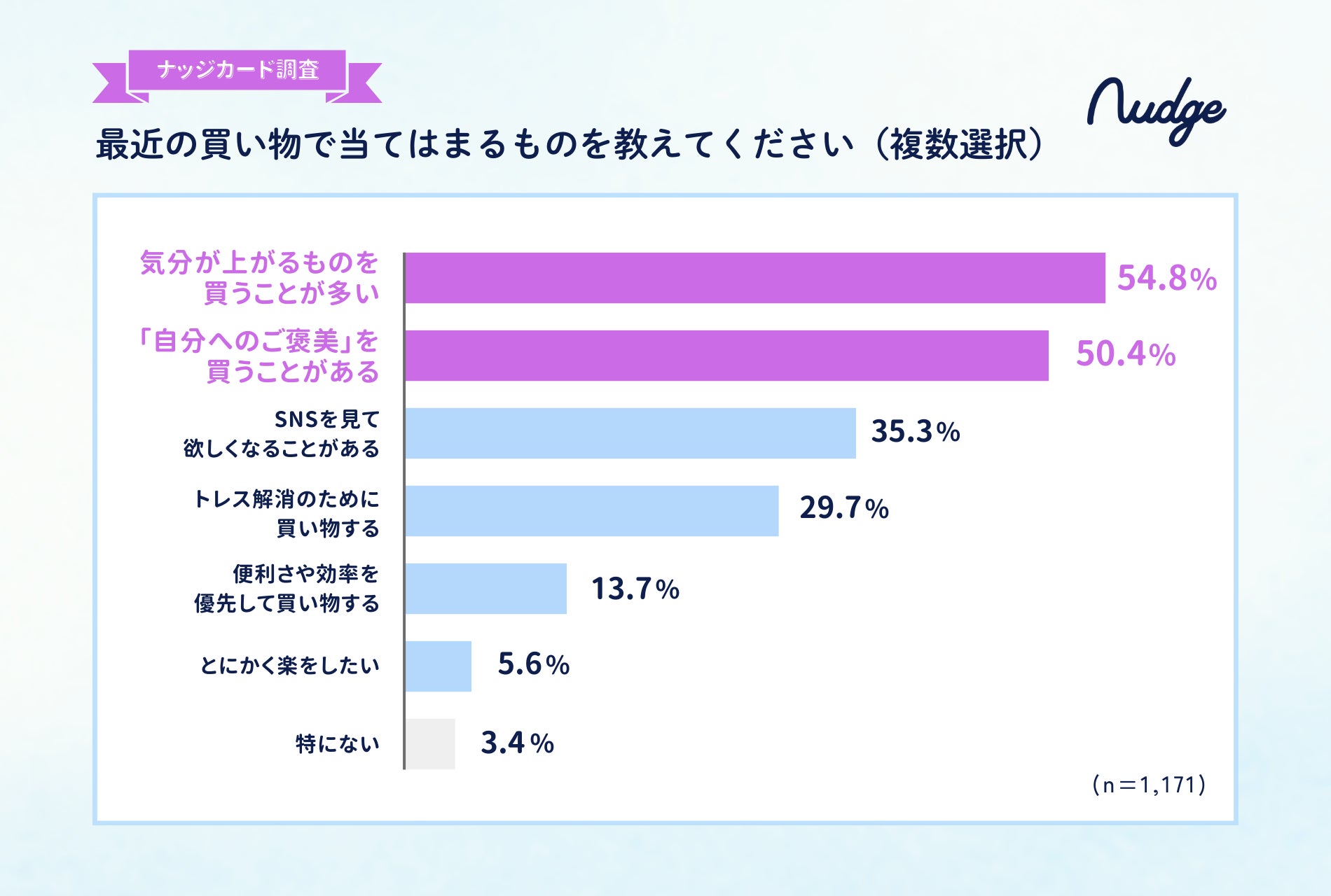 一方で、最近の買い物理由としては、「気分が上がるものを買う」(54.8%)「自分へのご褒美として買う」(50.4%)といった回答が多く、便利さや効率性よりも、気持ちの満足度を重視する傾向が見られました。