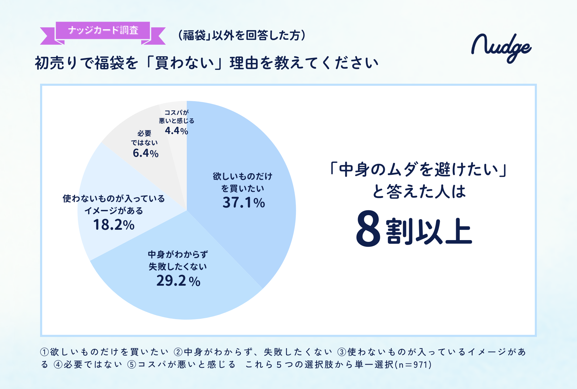 定番の福袋については、一定の関心が見られる一方で、「買わない」と回答した人に理由を尋ねたところ、「欲しいものだけを買いたい」(37.1%)、「中身がわからず失敗したくない」(29.2%)といった声が多く挙がりました。