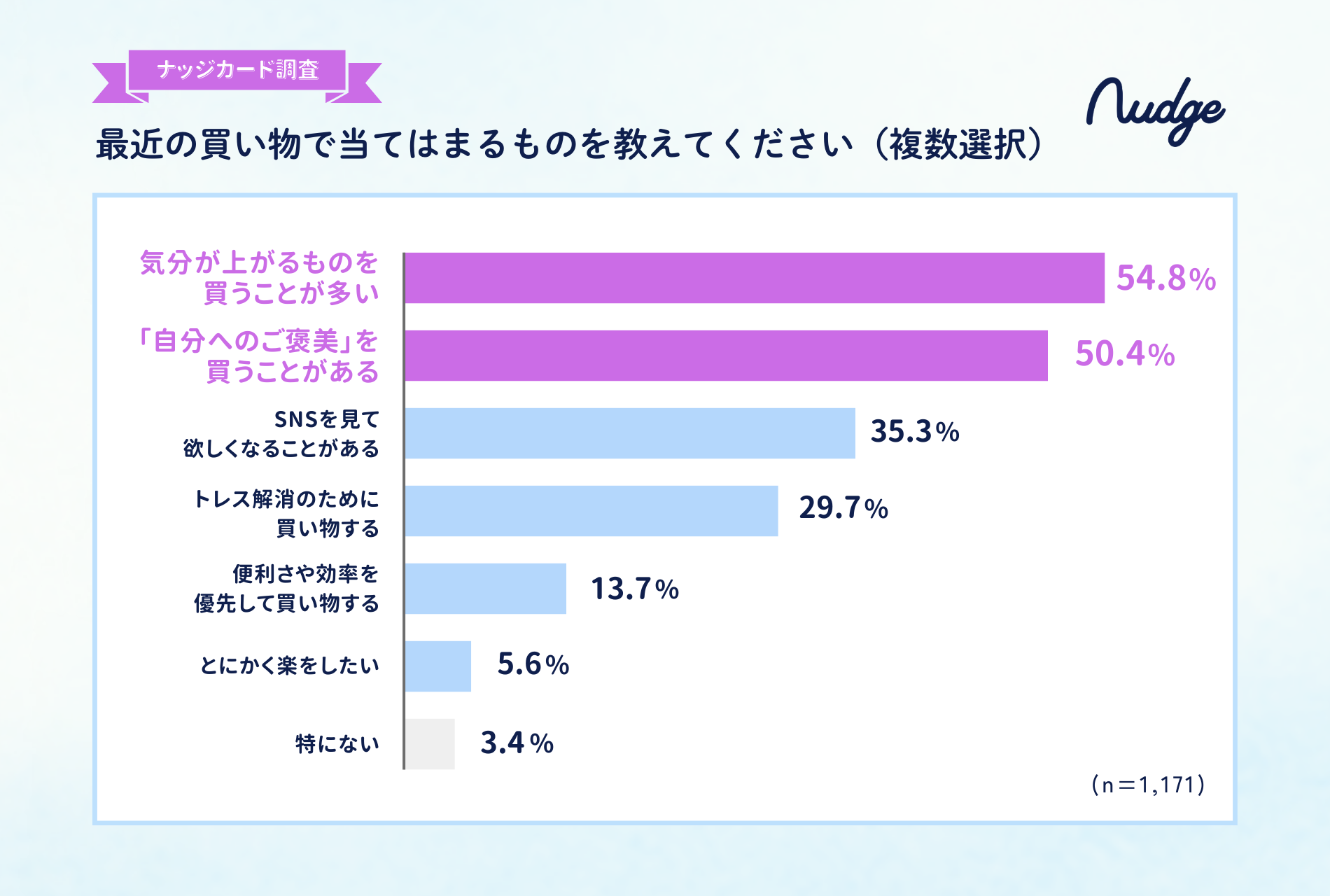 一方で、最近の買い物理由としては、「気分が上がるものを買う」(54.8%)「自分へのご褒美として買う」(50.4%)といった回答が多く、便利さや効率性よりも、気持ちの満足度を重視する傾向が見られました。