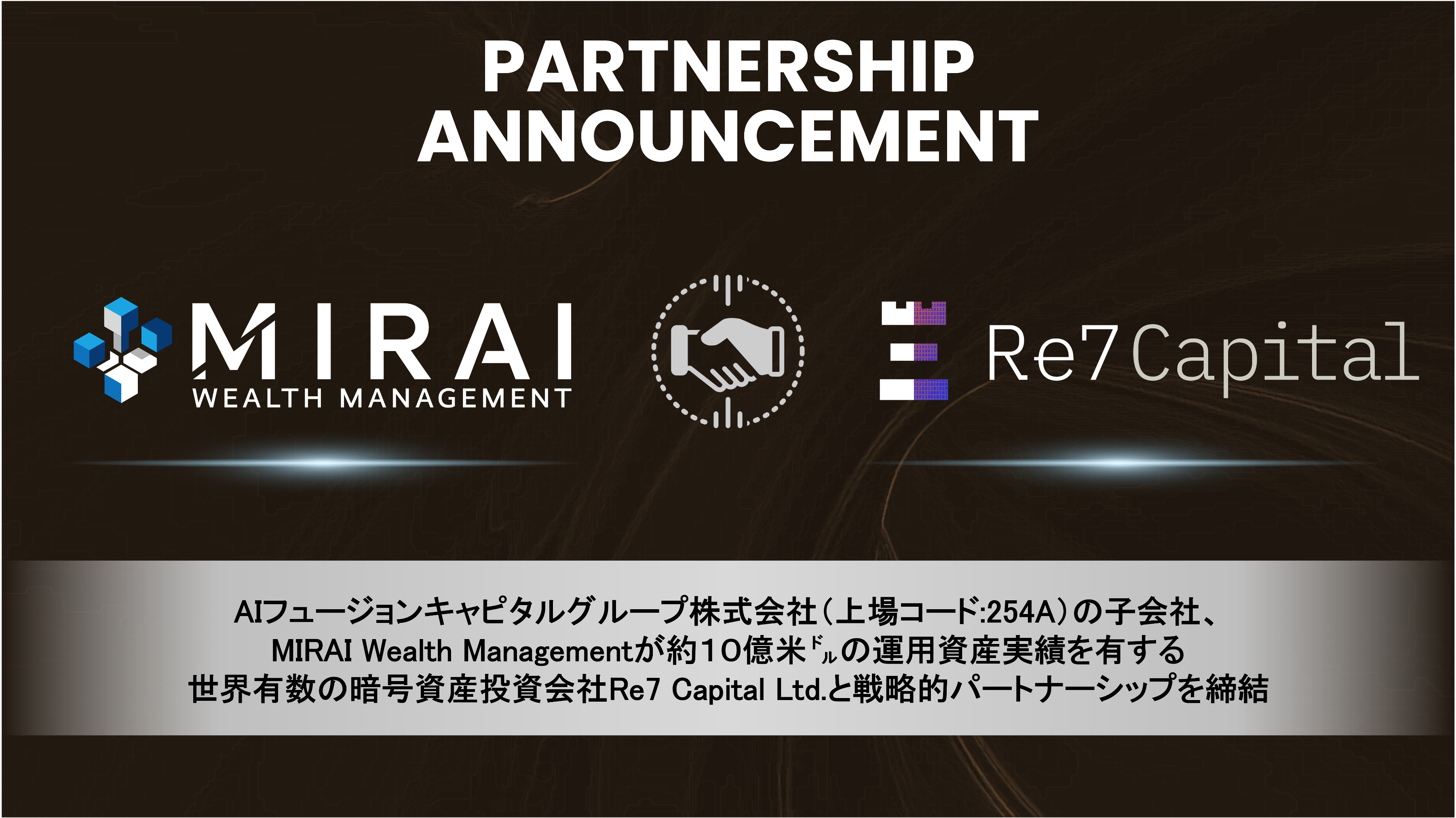 AIフュージョンキャピタルグループ株式会社の子会社であるミライウェルスマネジメント株式会社(以下、「当社」)は、世界の機関投資家、および富裕層を顧客として約10億米ドルもの暗号資産投資実績を有している世界有数の暗号資産投資会社であるRe7 Capital Ltd.(以下、「Re7」)と戦略的パートナーシップ(以下、「本パートナーシップ」)を締結したことをお知らせいたします。