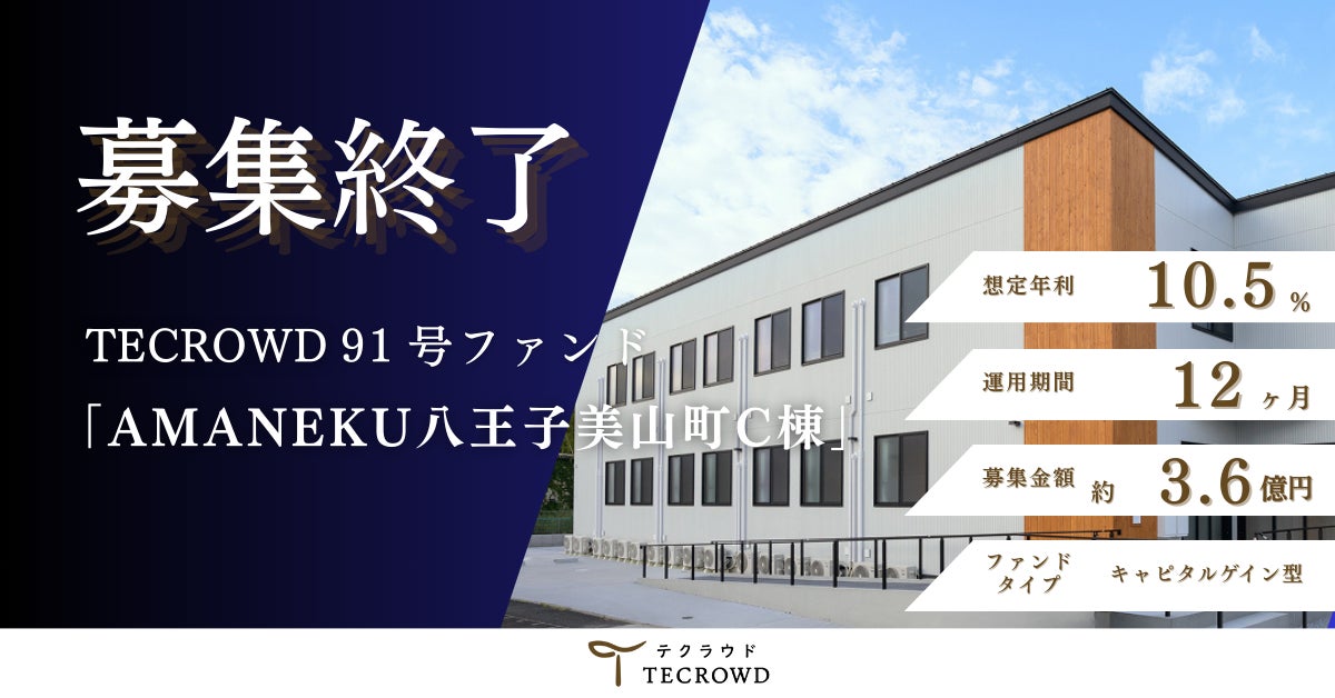 1口10万円から投資ができる不動産クラウドファンディング「TECROWD」の91号ファンド(募集金額約3.6億円)が募集を終了したことをお知らせいたします。