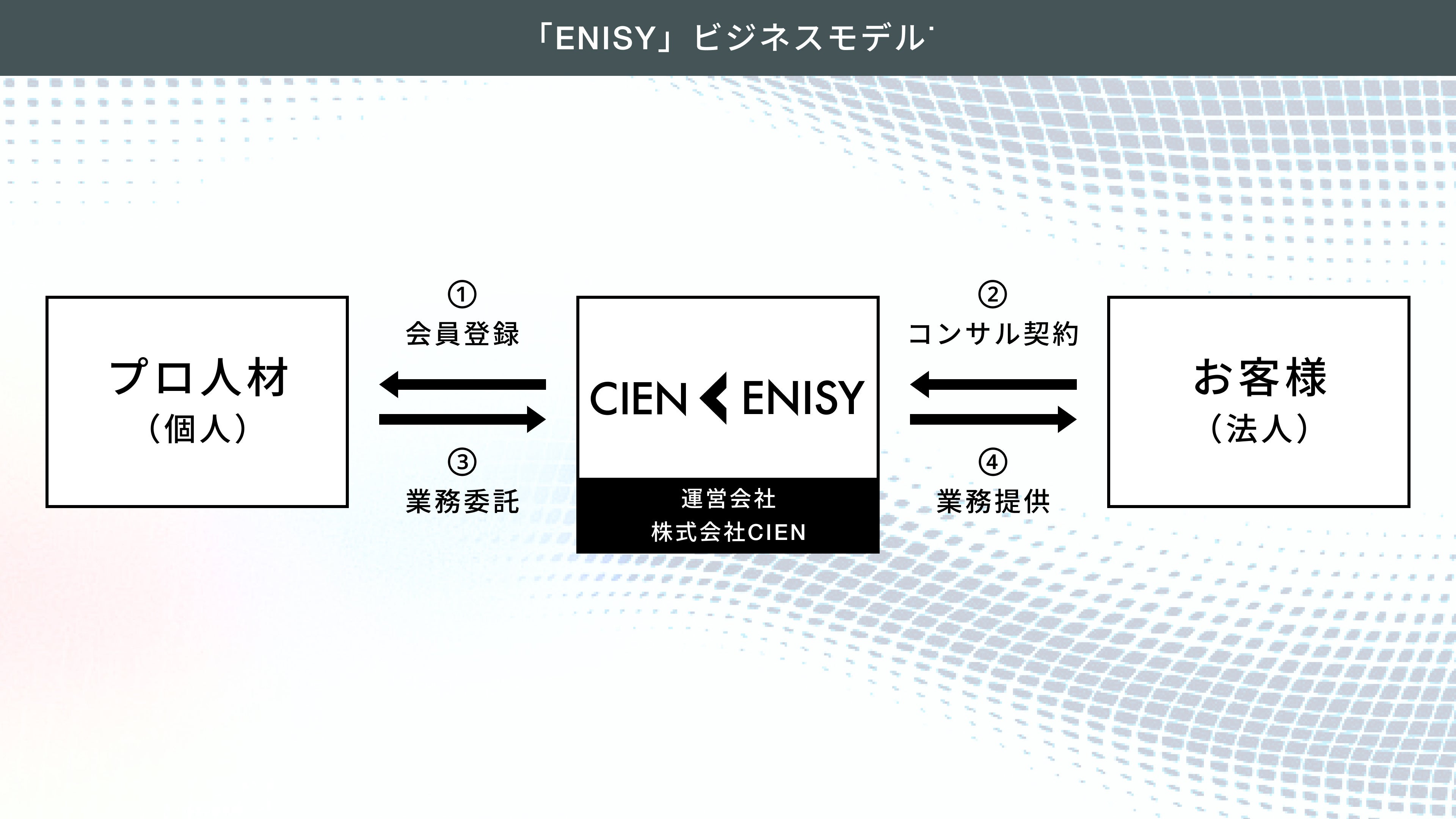 このような背景を踏まえ、当社はHRに関するプロフェッショナルサービスの提供(以下:HR事業)を通じて培った知見と、保険・コンプライアンス領域における専門性を融合し、保険業界に特化したプロシェアリング型人材プラットフォーム「CIEN ENISY」の構築・運営を開始いたしました。本サービスを通じて、様々な経験や能力を有した即戦力人材と企業を最適にマッチングさせ、保険業界における新たな人材活用モデルの創出を目指します。