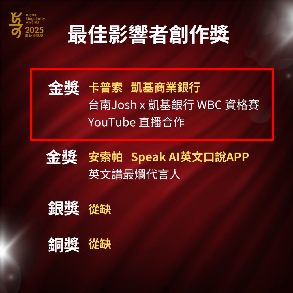 カプセルジャパン株式会社(本社:福岡県福岡市、代表取締役:埴渕修世)の台湾子会社である、卡普索股份有限公司(本社:台北市松山区、代表取締役:埴渕修世、以下両社をあわせて「CAPSULE」という)は、台湾デジタルメディア協会(DMA)が主催する「2025 デジタル・シンギュラリティ・アワード(數位奇點獎/Digital Singularity Awards、以下「DSA」)」において、凱基銀行と実施したキャンペーンが評価され、「インフルエンサーマーケティング部門|ベストインフルエンサー・クリエイション賞」の金賞を受賞いたしました。