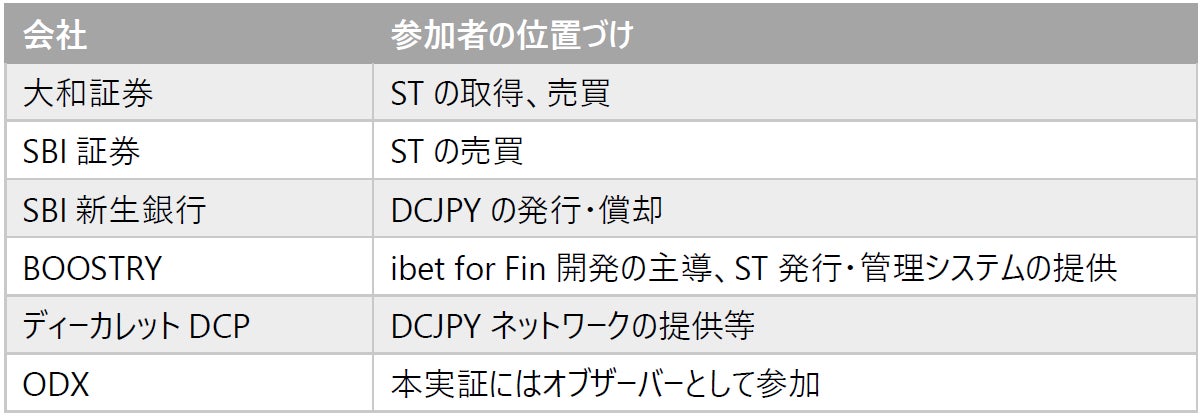 STの二次流通時におけるDCJPYを利用したDVP決済を本プロジェクトの実証スコープとしており、BOOSTRYが開発を主導し、コンソーシアム事務局として運営・維持を行うブロックチェーン”ibet for Fin”4をプラットフォームとして発行・管理されるSTと、ディーカレットDCPのプラットフォームを利用してSBI新生銀行が発行するDCJPYを実証過程で利用する予定です。本プロジェクトにおける実証スキームと各参加者の役割は以下の通りです。