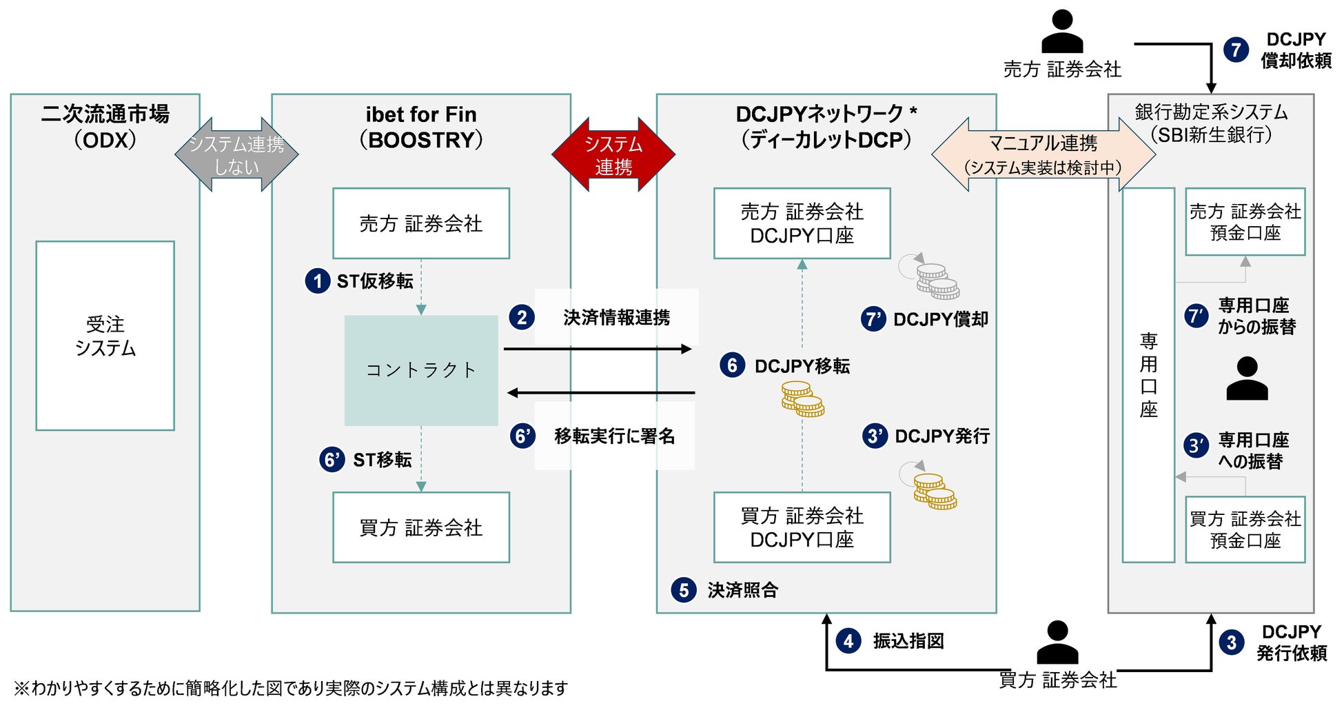 株式会社SBI証券(代表取締役社長:髙村 正人、以下「SBI証券」)、大和証券株式会社(代表取締役社長:荻野 明彦、以下「大和証券」)、株式会社SBI新生銀行(代表取締役社長:川島 克哉、以下「SBI新生銀行」)、株式会社BOOSTRY(代表取締役社長:平井 数磨、以下「BOOSTRY」)、大阪デジタルエクスチェンジ株式会社(代表取締役社長:朏 仁雄、以下「ODX」)、株式会社ディーカレットDCP(代表取締役会長兼社長執行役員CEO:村林 聡、以下「ディーカレットDCP」)は、セキュリティトークン(以下「ST」)1の二次流通市場の発展に向けた新たな決済スキームを実現するべく、トークン化預金DCJPY(以下「DCJPY」)を利用したSTのDVP2決済の実証(以下「本プロジェクト」)に関する協業を開始しました。本プロジェクト関係者は、2025年8月に、検証用データを用いたSTとDCJPYのDVP決済の検証を実施し、STの二次流通時を想定したDVP決済に係るシステムイメージと業務フローの整理を概ね完了しております。今後、STおよびDCJPYの実発行による検証に取り組んで参ります。