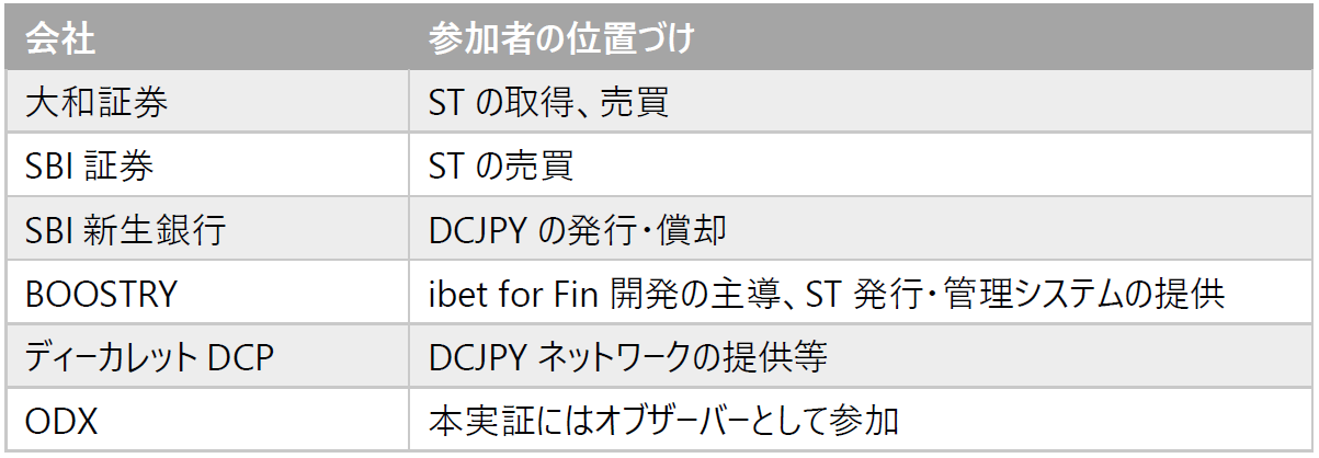 STの二次流通時におけるDCJPYを利用したDVP決済を本プロジェクトの実証スコープとしており、BOOSTRYが開発を主導し、コンソーシアム事務局として運営・維持を行うブロックチェーン”ibet for Fin”4をプラットフォームとして発行・管理されるSTと、ディーカレットDCPのプラットフォームを利用してSBI新生銀行が発行するDCJPYを実証過程で利用する予定です。本プロジェクトにおける実証スキームと各参加者の役割は以下の通りです。