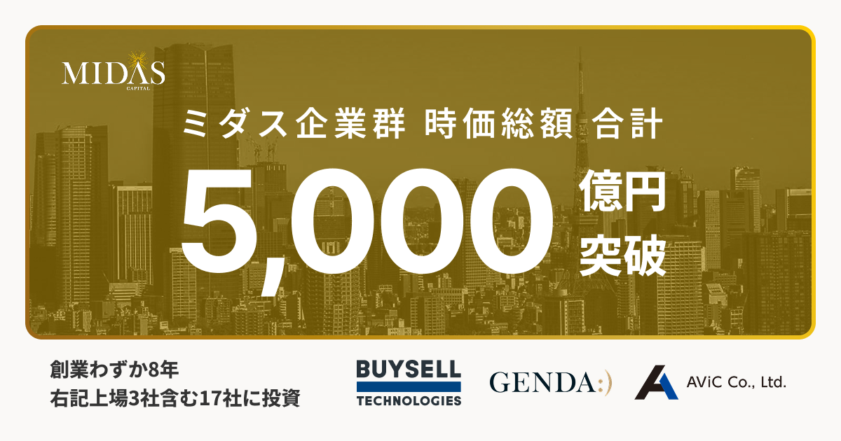 株式会社ミダスキャピタル(本社:東京都港区、代表取締役社長:吉村英毅、以下「当社」)は、投資先企業群時価総額の総計が5,000億円 *を突破したことと当社WEBサイトをリニューアルしたことをお知らせいたします。