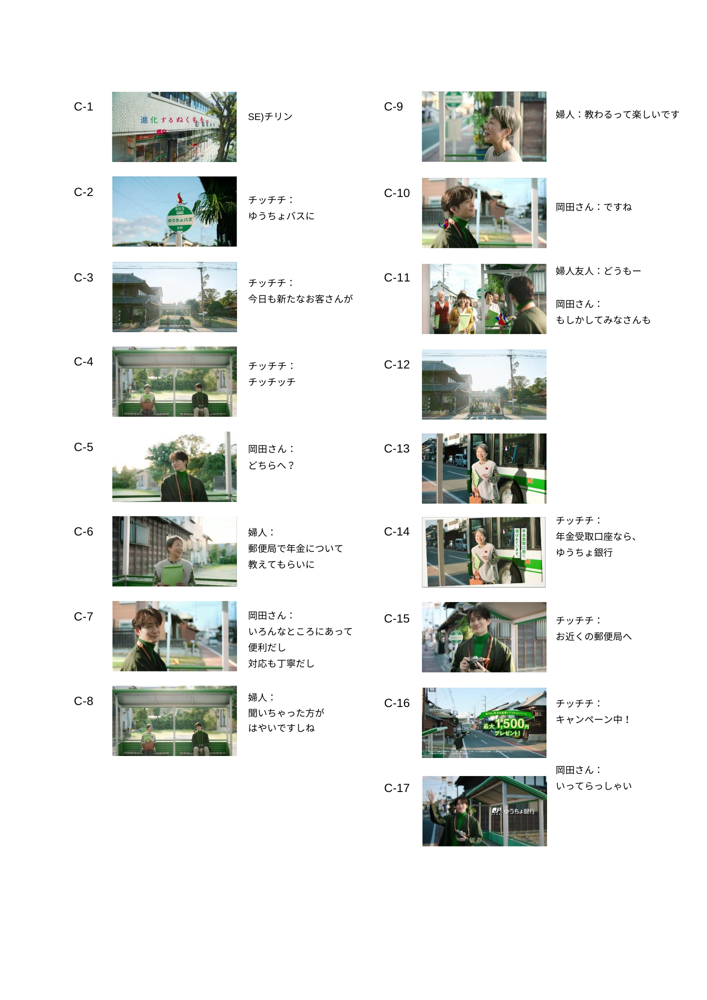 「3色の鳥・ゆうちょバス 年金受取口座」篇では、全国津々浦々に郵便局・ゆうちょ銀行がある便利さ、身近さや対応の丁寧さを改めて印象付けることで、「年金受取ならゆうちょ銀行」というメッセージを、好奇心旺盛で明るいご婦人と、岡田さんのイキイキとしたやりとりで伝えています。いくつになっても学ぶことを楽しみ、セカンドライフを前向きに謳歌するご婦人の姿が特徴的です。30秒バージョンでは、多くのシニアの方々も交えたチャーミングなやり取りが描かれ、賑やかで楽しい世界観を表現しています。