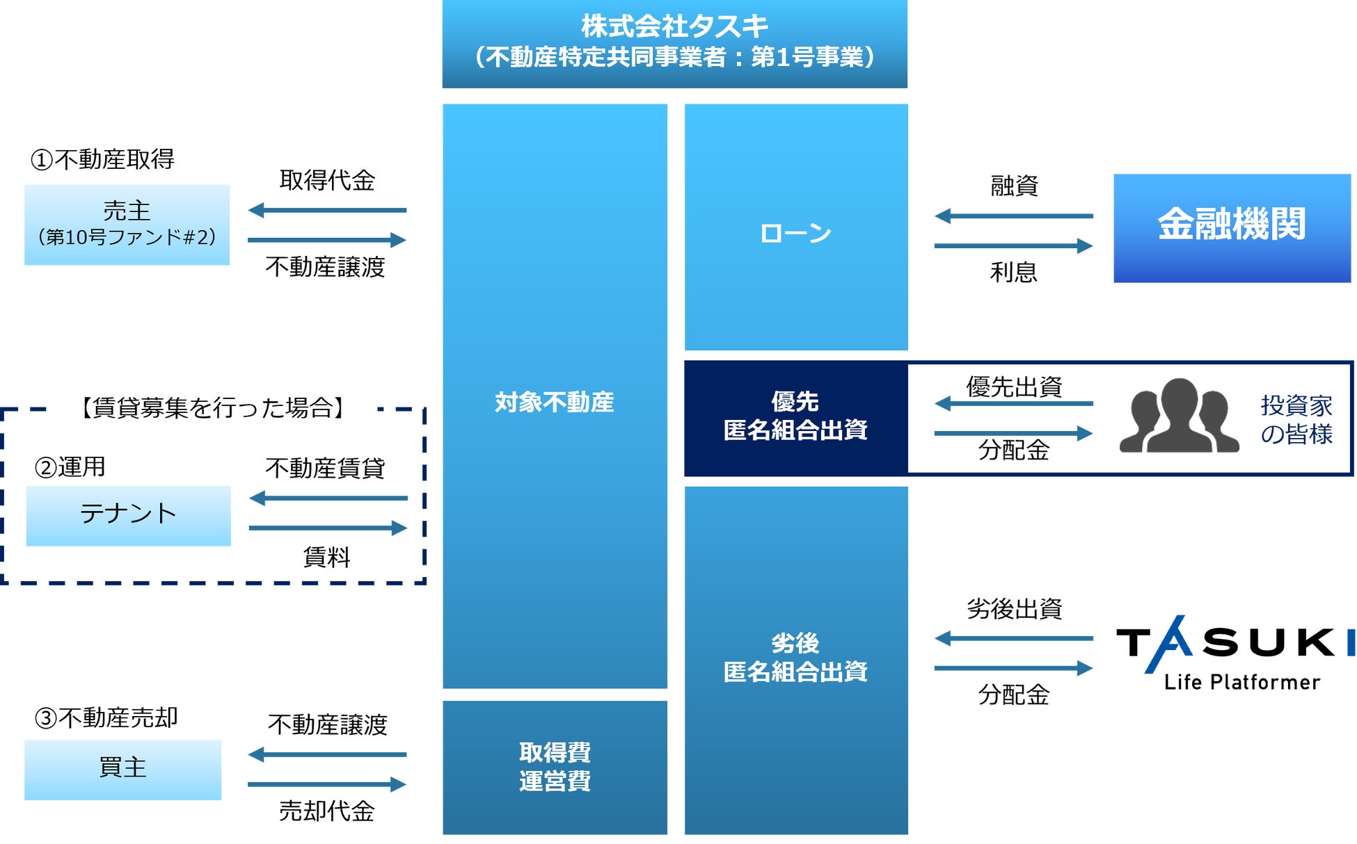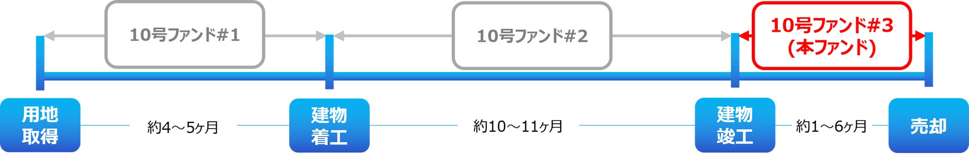 本ファンドは、用地の取得から建築確認済証の取得・着工までを運用期間とした「タスキ キャピタル重視型 第10号ファンド#1」および着工から竣工までを運用期間としている「タスキ キャピタル重視型 第10号ファンド#2」に続くフェーズとして、竣工から売却までを運用期間とする「タスキ キャピタル重視型 第10号ファンド#3」を組成するものです。同一物件に対し、プロジェクトの進行度合いによる事業リスクの程度に応じて段階的にクラウドファンディングを組成し、投資家のみなさまの新たな投資機会の創出と、資金流動性の向上を図ります。