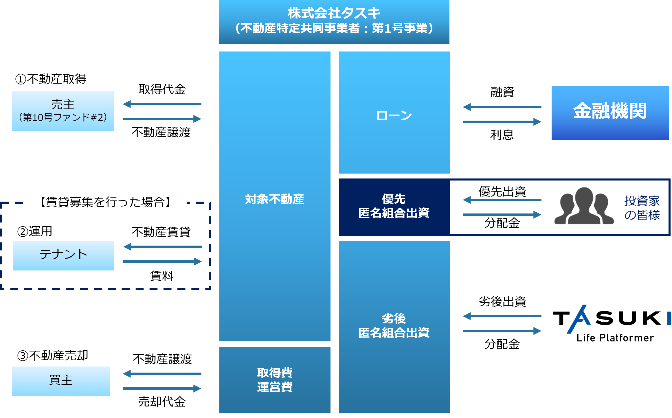 本ファンドは優先劣後方式により、投資家の皆様へは優先出資分として800口を募集します。一方、タスキは2,400口を劣後出資いたします。万一、損失が発生した場合、タスキが先に損失部分を負担しますので、投資家の皆様は、タスキより優先して出資金の返還を受けることができます。