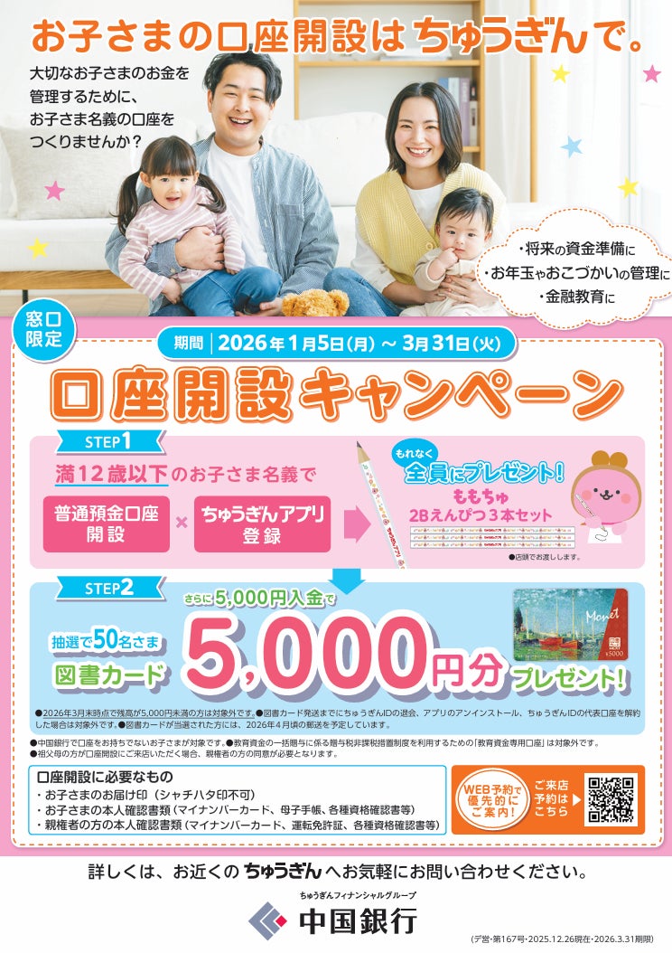 中国銀行(岡山市 頭取 加藤 貞則)では、2026年1月5日(月)より、「お子さま口座開設キャンペーン」を実施しております。