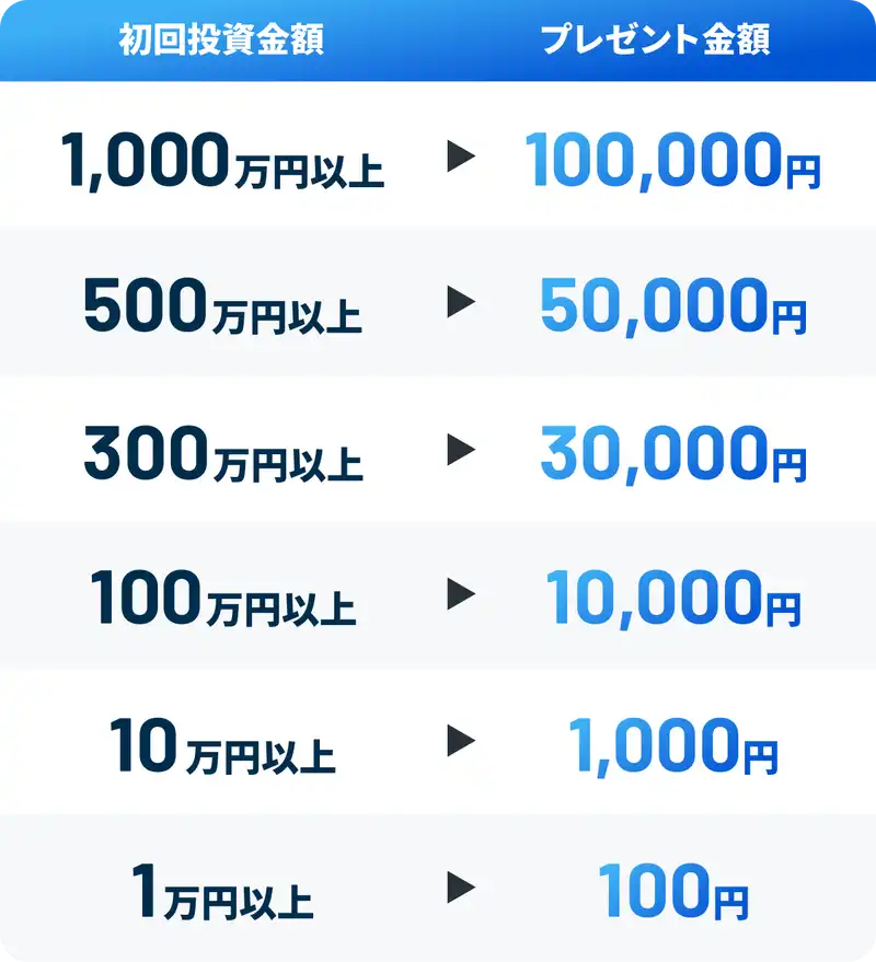1万円以上の初回投資で、もれなく最大10万円分の残高をプレゼント