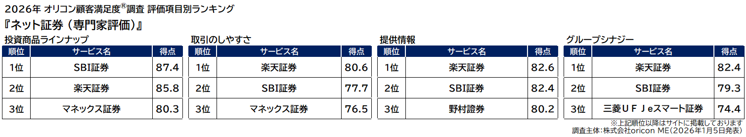 オリコン株式会社(本社:東京都港区 代表取締役社長:小池 恒 略称:オリコン)は、グループ会社である株式会社oricon MEが、金融系の専門家※を対象に実施した『ネット証券』『iDeCo(証券会社/銀行)』『FX』のランキング結果を、2026年1月5日(月)14時に発表いたしました。結果は、下記の通りとなりました。