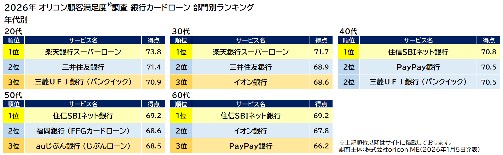 オリコン株式会社(本社:東京都港区 代表取締役社長:小池 恒、略称:オリコン)は、グループ会社である株式会社oricon MEが、実際のサービス利用者を対象に第三者の立場で実施した『カードローン』についての顧客満足度調査の結果を、2026年1月5日(月)14時に発表いたしました。