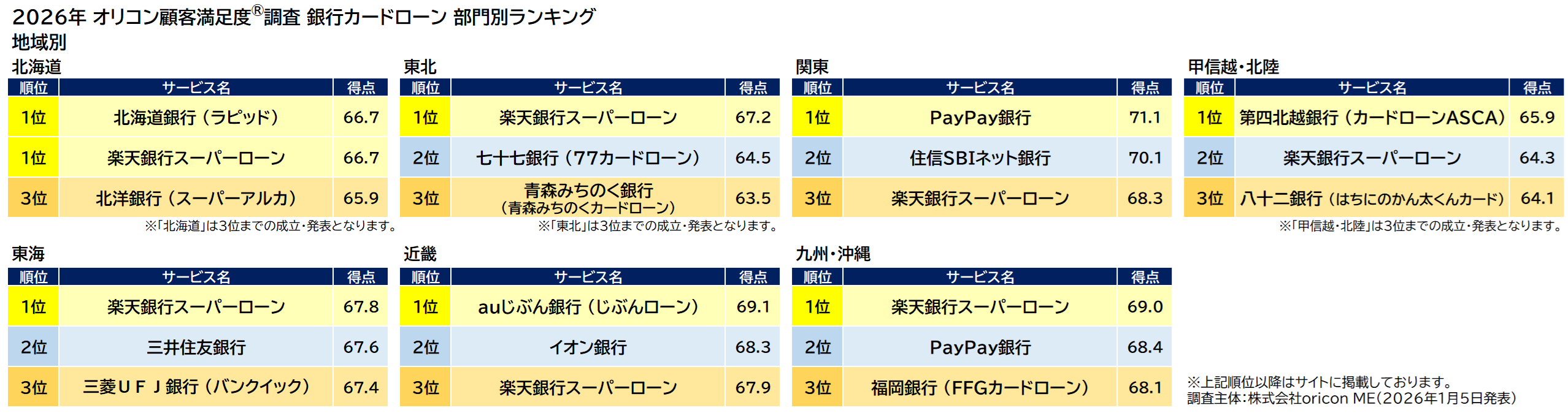 ・地域別(※『銀行カードローン』のみ発表)「北海道」「東北」「関東」「甲信越・北陸」「東海」「近畿」「九州・沖縄」