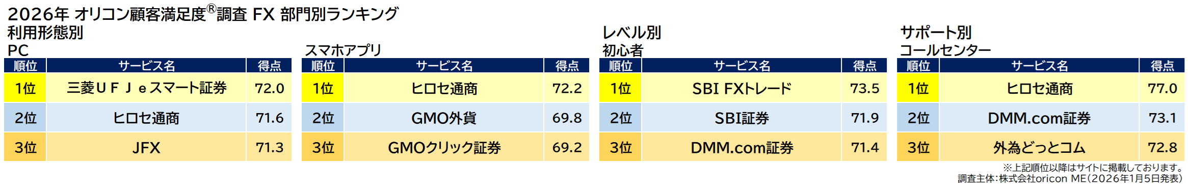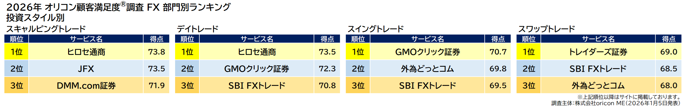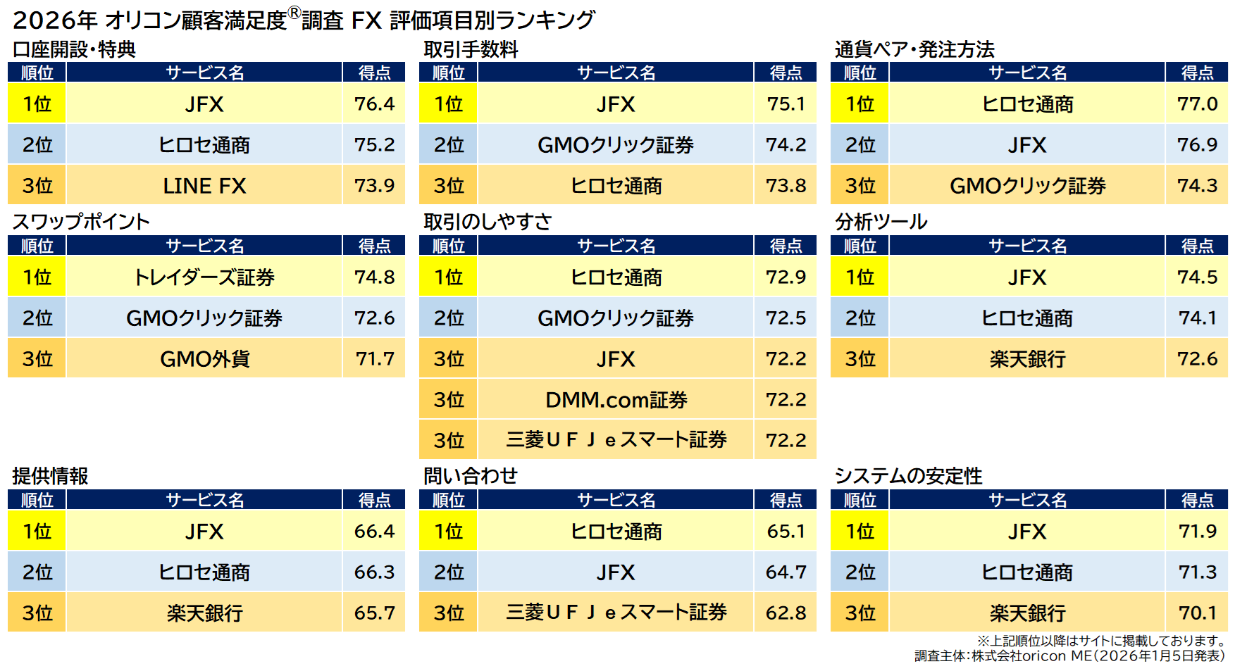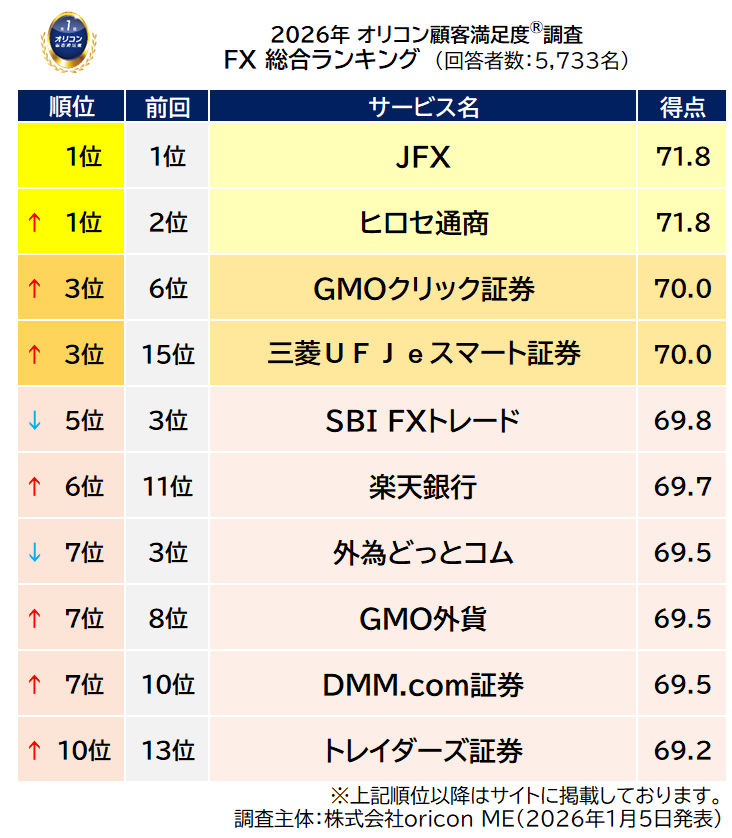 オリコン株式会社(本社:東京都港区 代表取締役社長:小池 恒、略称:オリコン)は、グループ会社である株式会社oricon MEが、実際のサービス利用者を対象に第三者の立場で実施した『FX』についての顧客満足度調査の結果を、2026年1月5日(月)14時に発表いたしました。