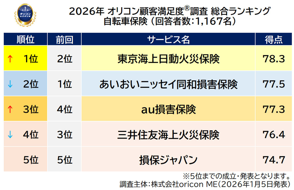 『自転車保険』総合ランキング(2026年 オリコン顧客満足度®調査)
