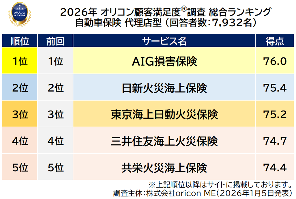『自動車保険 代理店型』総合ランキング(2026年 オリコン顧客満足度®調査)
