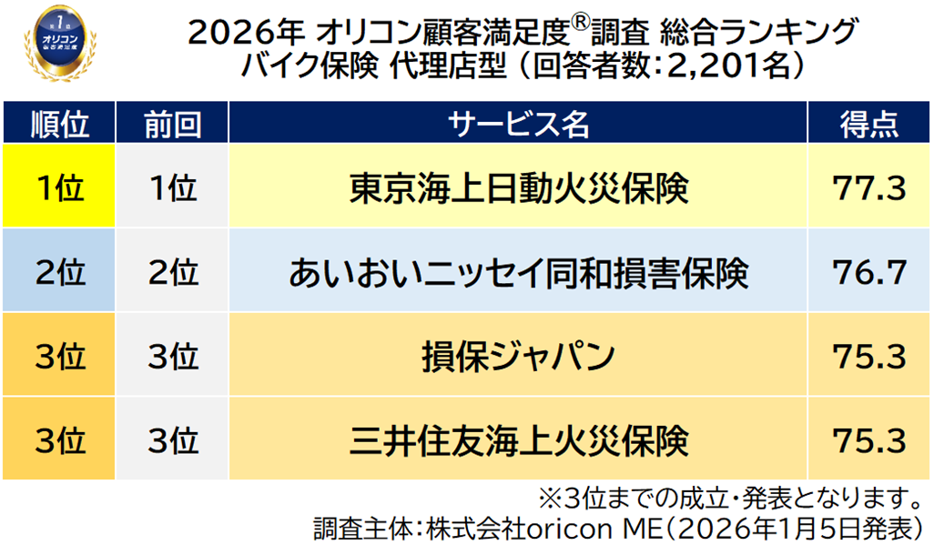 『バイク保険 代理店型』総合ランキング(2026年 オリコン顧客満足度®調査)