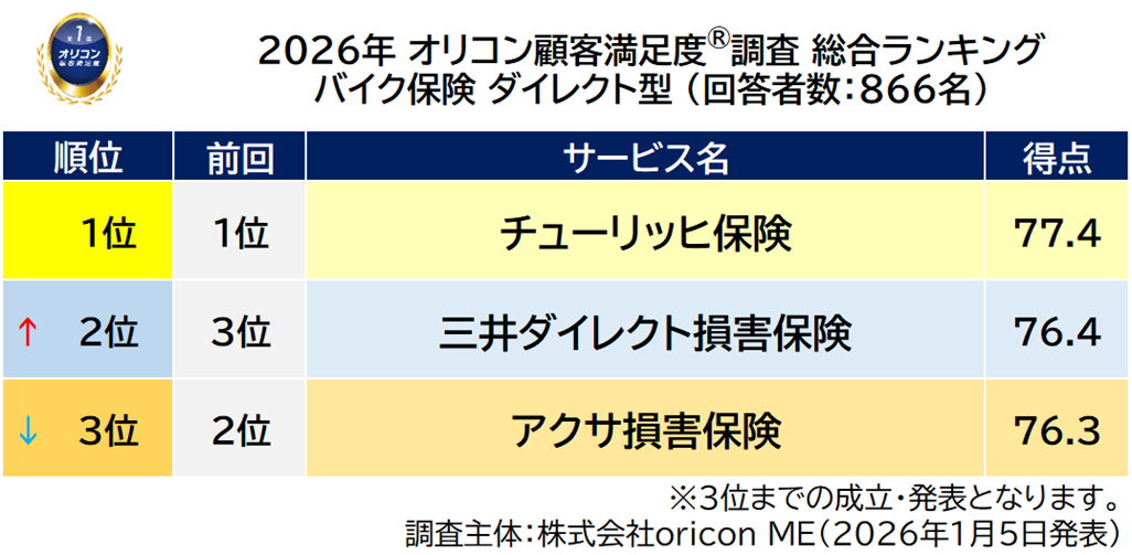『バイク保険 ダイレクト型』総合ランキング(2026年 オリコン顧客満足度®調査)