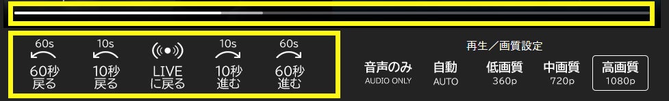・ライブ配信画面下のボタンもしくはシークバーを操作して任意の位置まで巻き戻し・早送りができます