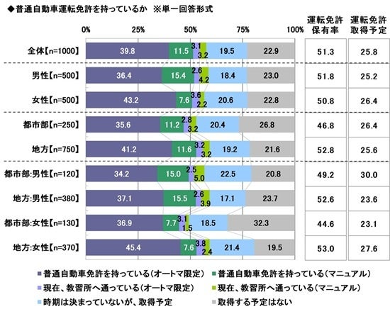 また、「現在、教習所へ通っている(オートマ限定)」は3.1%、「現在、教習所へ通っている(マニュアル)」は3.2%、「時期は決まっていないが、取得予定」は19.5%で、合計した『運転免許取得予定』は25.8%でした。