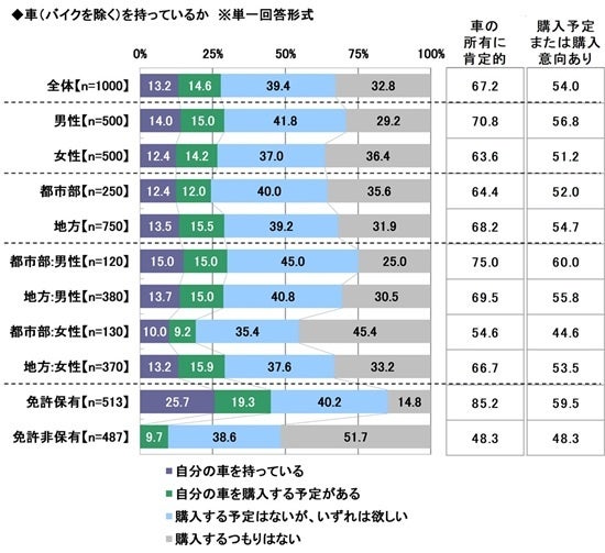 次に、車(バイクを除く)を持っているかを聞いたところ、「自分の車を持っている」は13.2%、「自分の車を購入する予定がある」は14.6%、「購入する予定はないが、いずれは欲しい」は39.4%で、合計した『車の所有に肯定的』な方の割合は67.2%、「購入するつもりはない」は32.8%となりました。