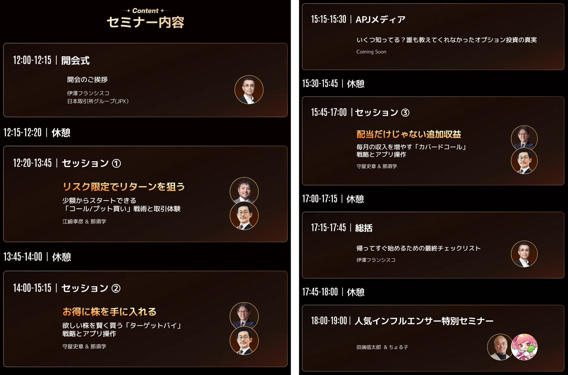 本イベントの講師には、江﨑孝彦氏、守屋 史章氏、田端 信太郎氏、そして新たに決定したちょる子氏という、オプション界のトップランナーが集結。初心者が明日からオプション取引を始めるのに最適な「3つの戦略」を伝授します。