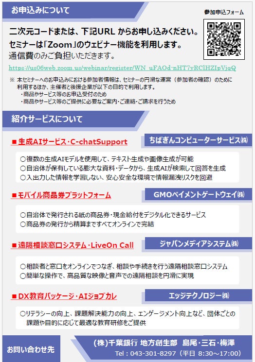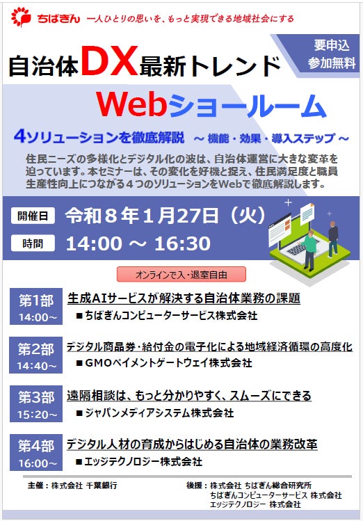 千葉銀行は、2026年1月27日(火)、デジタル技術の活用による住民満足度と職員の生産性向上を支援するため、オンラインセミナー「自治体DX最新トレンド Webショールーム」を開催します。