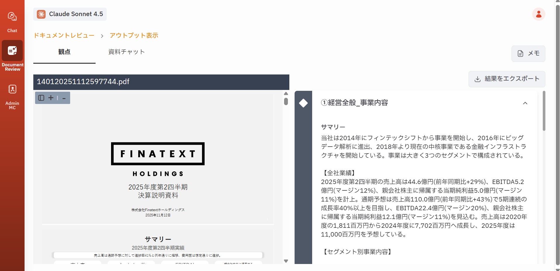 大和アセットマネジメントの社員専用の生成AIアプリケーション。OpenAI社のGPTシリーズ、Anthropic社のClaudeシリーズをはじめとした複数の生成AIサービスが利用できる。大和アセットマネジメントのAWS環境上に独自に構築されており、UI/UXや機能まで幅広いカスタマイズが可能。