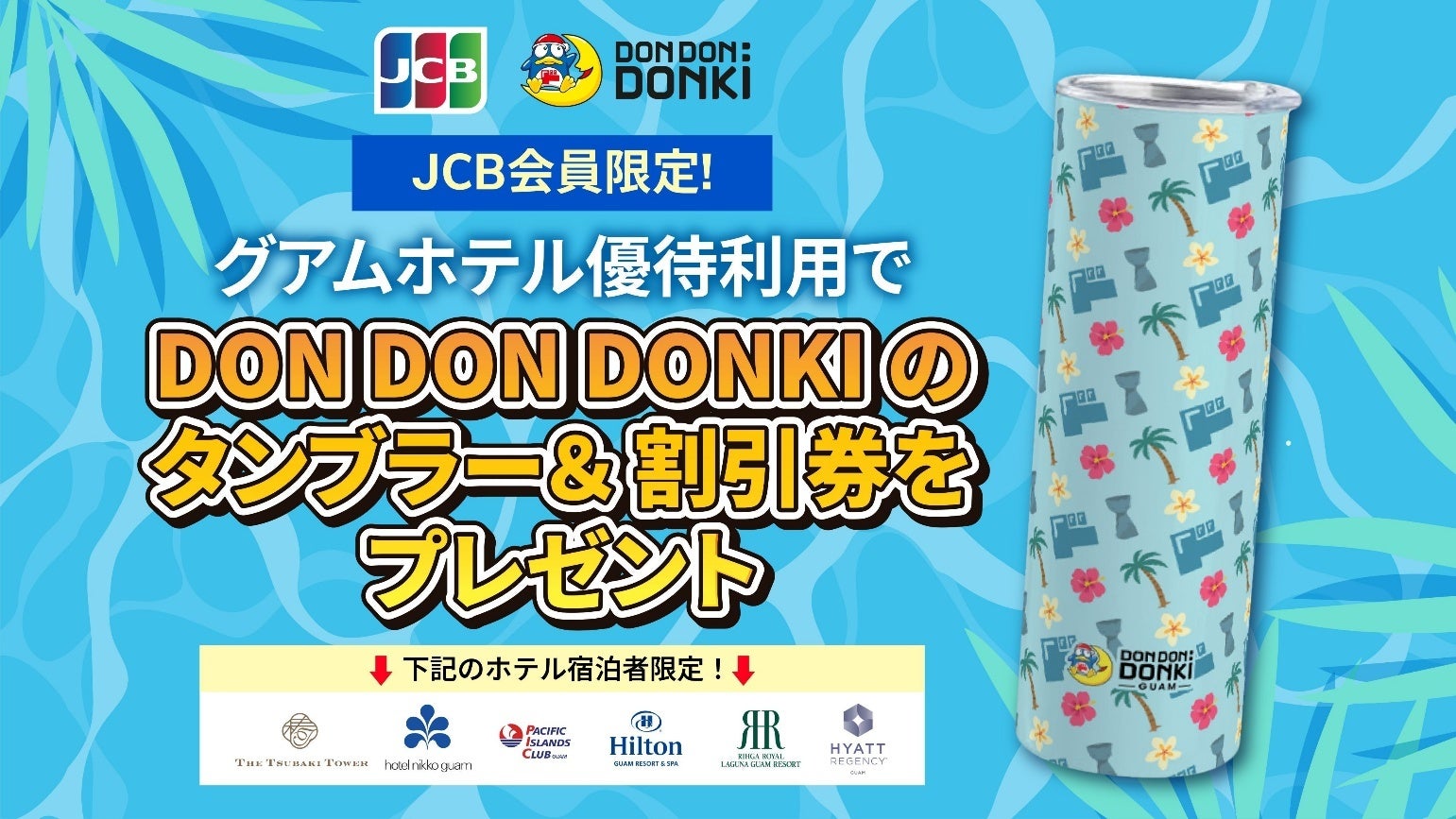 日本発唯一の国際カードブランド運営会社である株式会社ジェーシービーの海外業務を行う子会社、株式会社ジェーシービー・インターナショナル(以下、総称して JCB)は、株式会社ケン・ホテル&リゾートホールディングスと、「DON DON DONKI」を運営するパン・パシフィック・リテールマネジメント(グアム)との特別キャンペーンを2026年6月30日(火)まで実施いたします。期間中、専用ページから対象ホテルを予約して宿泊すると、グアムのDON DON DONKIのオリジナルタンブラーと割引券をプレゼントいたします。