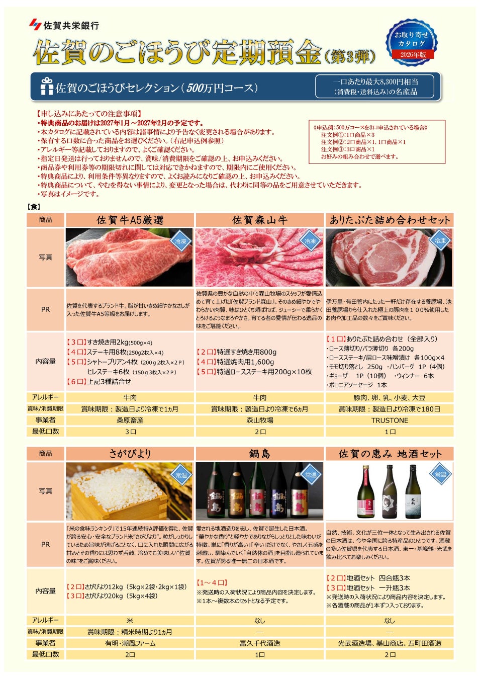 本キャンペーン期間中に、「佐賀のごほうび定期預金第3弾」にお預け入れいただいたお客さまは、佐賀県の名産品を集めたカタログの中からお好きな特典を選んでいただけます。さらにお預入れの口数に応じて、より特別な特典をお選びいただけます。