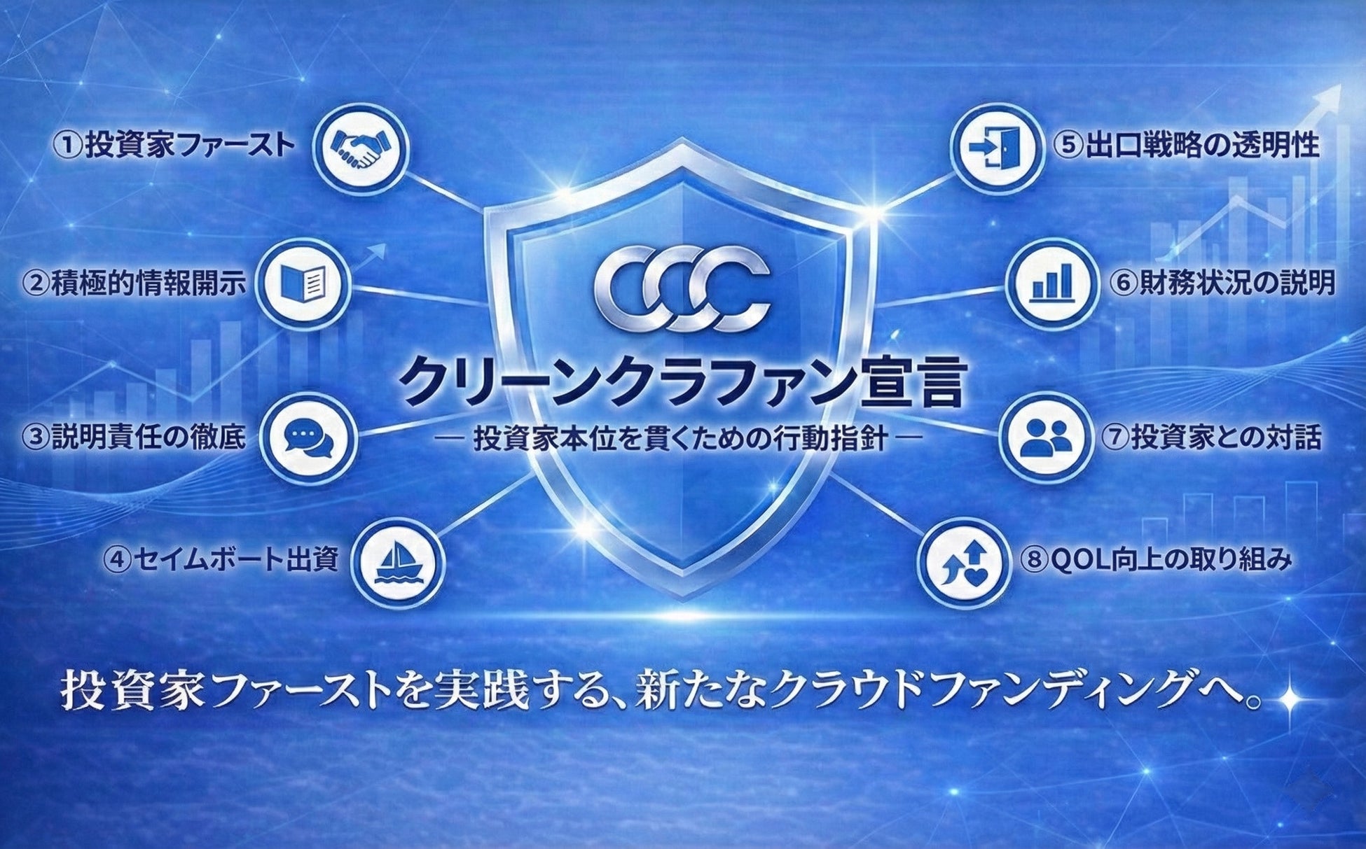 今回『クリーンクラファン宣言(CCC)』を策定した理由は、この責任を抽象的な理念で終わらせず、皆様に見える形での「コミットメント(実行宣言)」とするためです。 私たちがどのような思想でリスクに向き合い、誠実を尽くすのか。その「判断基準」をガラス張りにすることが、不透明な時代における唯一の安心材料であり、納得感のある投資への第一歩だと信じています。
